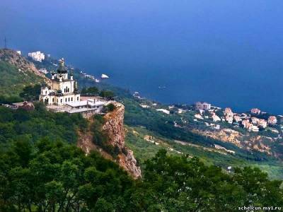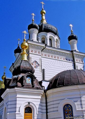 Ее трудно не увидеть! Нарядная белая церковь с золочеными маковками построена в 1892 году на Красной скале и является одной из визитных карточек Крыма. Эта скала сама по себе очень красива. Высота её 412 метров над уровнем моря. Название скалы имеет два объяснения. Одни считают, что «красная» — значит «красивая». Другие — что название объясняется её розовым оттенком.