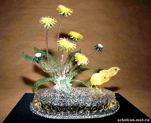 Стебель словно только, что сорванного, цветка, сделан из золота, листочки вырезаны из нефрита, а сам одуванчик создан из тысяч тончайших серебряных тычинок, на кончике каждой из которых закреплён натуральный пух одуванчика.