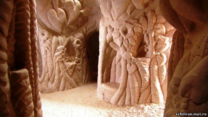 В пещерах он прорезает окна в стенах и потолках, и солнце днем заливает залы яркими лучами. Свои таинственные подземные дворцы Ра называет «первозданными святилищами», в которых человек, оставаясь наедине с собой, может почувствовать душу мира. Творит он ради собственного удовольствия и самовыражения. А пока работает, устраивает в пещере уютный уголок для себя, в котором есть все, что нужно для жизни.