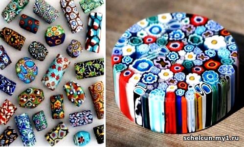 Мало того, современные умельцы-художники пошли дальше. Эту технику они мастерски применили к полимерным глинам, парафиновому воску и другим современным материалам. Поскольку они достаточно гибки и пластичны, поддаются подогреву и комбинированию их мастерски применяют в создании миллефиори.