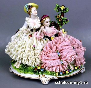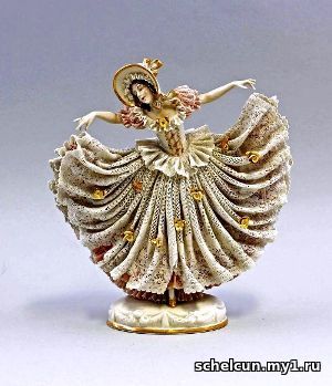 Этот удивительный фарфор, кажущийся таким легким и невесомым, называют также «Дрезденским фарфором». В конце XVIII века приступили к массовому изготовлению статуэток. В основном это были фигурки балерин, танцовщиц, прекрасных дам в пышных нарядах из тончайшего кружева, галантных кавалеров.