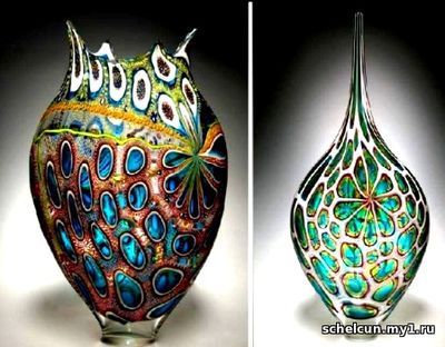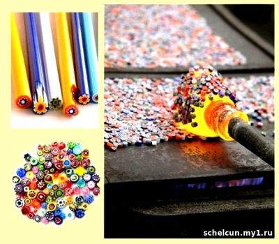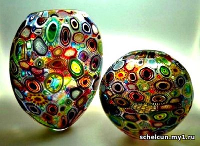 Такие мозаичные изделия собираются из маленьких стеклянных фрагментов - мурин, а потом сплавляются вместе под действием высокой температуры и формируются мастером-стеклодувом в необыкновенно красивые сосуды, предметы и украшения.