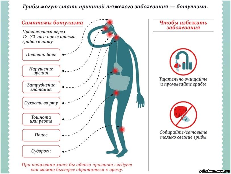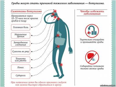 Заболевание ботулизмом проявляется спустя 12–72 часа после приёма грибов в пищу. Клинические проявления заболевания ботулизма: