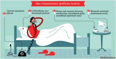 Если после употребления в пищу грибов появились признаки отравления, то необходимо срочно вызвать врача. До его прихода рекомендуется постельный режим и обильное питьё. Пить можно холодную воду, холодный крепкий чай. Также можно применить активированный уголь.