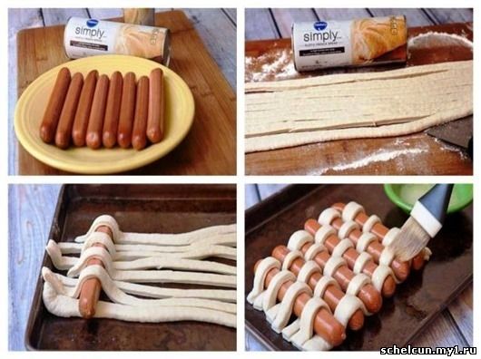 Тесто немного раскатать и нарезать полосками примерно по 2 см шириной. Колбасу очистить и нарезать тонкими ломтиками, и каждый – пополам, чтобы получились полукруги.