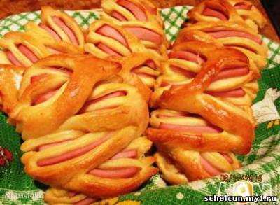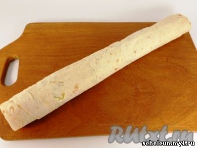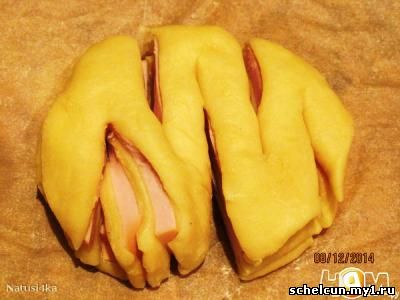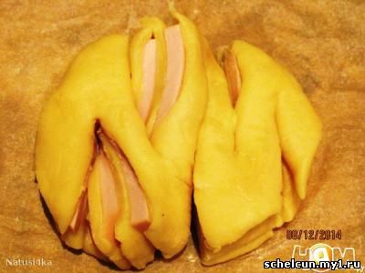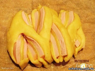 Колбасу выложить на полоску теста так, чтобы один край теста был свободным, а за другой колбаса выступала.
