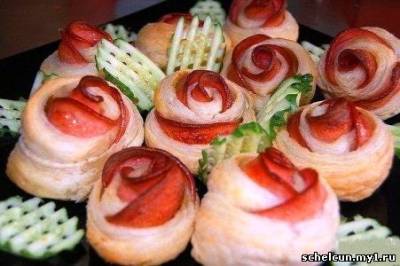 Как приготовить вкусные розочки из колбасы и слоеного теста: