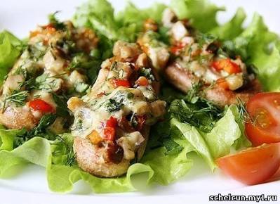 -Залить сушки (баранки) молоком и выдержать их так минут 15-20. -Окорок, перец, зелень и грибы нарезать мелко, соединить в салатнике. Добавить натертый на мелкой терке сыр, перемешать. -На противень, покрытый бумагой для запекания или силиконовым ковриком, выложить сушки (баранки) и заполнить их получившейся смесью. Поставить в разогретую до 180 гр духовку минут на 10-15. -Подать закуску на листьях салата, украсить блюдо половинками помидоров черри.