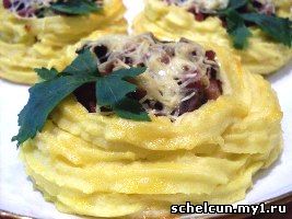 Готовый картофель взбить в пюре, добавить сливочное масло, яичные желтки и мелко натертый сыр. Все это тщательно взбить.