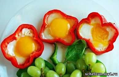 Аккуратно нарезаем перец без семян кружочками толщиной около 1 см. Выкладываем на сковороду и разбиваем яйцо в каждый кружочек. Прижимайте колечки вилкой плотнее ко дну сковороды, иначе жидкий белок может вытечь и не получится красиво. Как только белок схватился, можно посолить, поперчить и накрыть крышкой.
