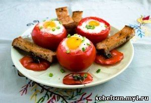 1. Нагрейте духовку до 190C. Срежьте шляпки у помидоров. Ложкой достаньте сердцевину и семена. 2. Противень застелите бумагой для выпечки. Поставьте полые помидоры на противень. В каждый положите по чайной ложке масла. Вбейте туда яйцо. 3. Посолите по вкусу. Выпекайте 25-30 минут. Поперчите по вкусу. Украсьте зеленым луком. 4. Подавайте горячими с хлебом или хлебными палочками.
