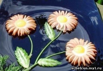 3 сосиски, 3 яйца, зубочистки Разрезаем сосиски напополам, после чего каждую половинку сосиски надрезаем поперек по всей длине, делая “бахрому” - лепестки. Складываем обе половинки сосиски, чтобы получился кружок. Концы скрепляем зубочистками. Аккуратно кладем получившиеся колечки на разогретую сковороду, даем чуточку поджариться. Аккуратно разбиваем в центр яйца. Яйцо может выбежать за пределы сосиски, это не страшно. Ждем пока яйца поджарятся. И выкладываем на тарелку. При помощи зеленого лучка, делаем нашим сосисочным цветам стебли. Сбежавшую за пределы сосисок яичницу можно аккуратно обрезать (и съесть).